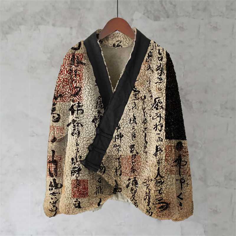 Japanese Ancient Calligraphy Cozy Fleece Kimono Cardigan