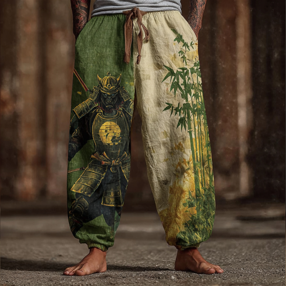 Men's Bamboo Forest And Armored Cat Print Art Linen-cotton Blend Casual Pants