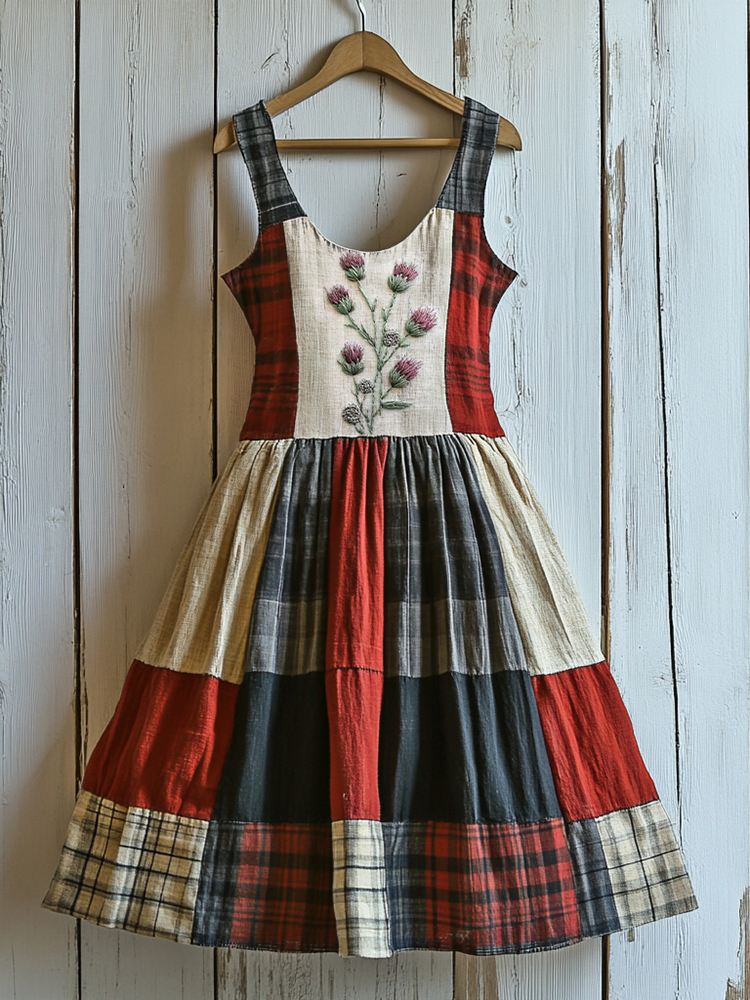 Women's Scottish Thistle Vintage Plaid Art Linen Mini Dress