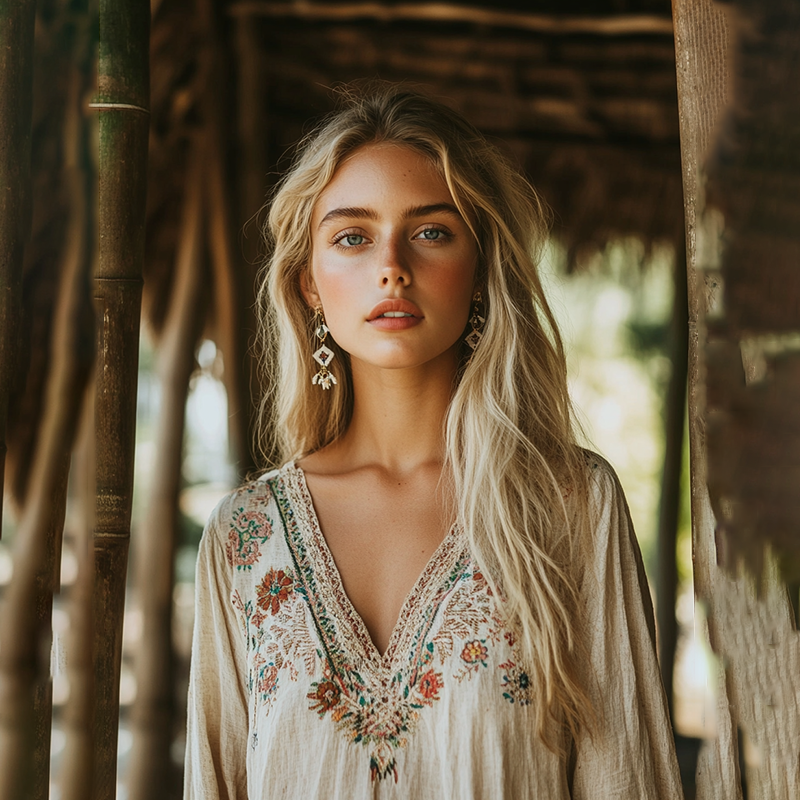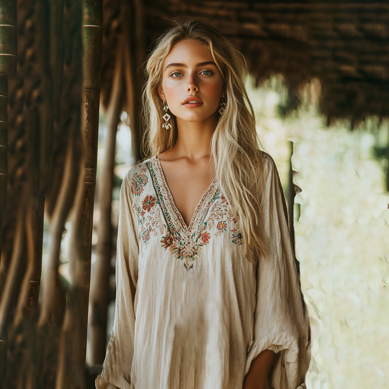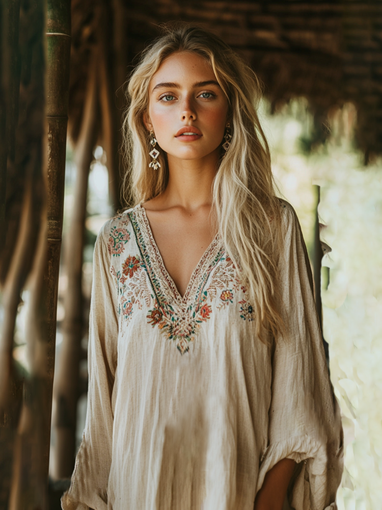 Boho Floral Tribal Embroidery Print Cotton And Linen Blend Loose Blouse