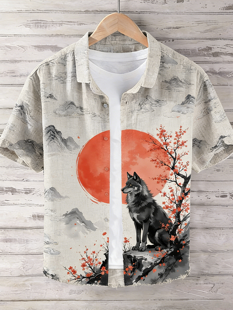 Japanese Art Style Retro Wolf Pattern Cotton And Linen Shirt