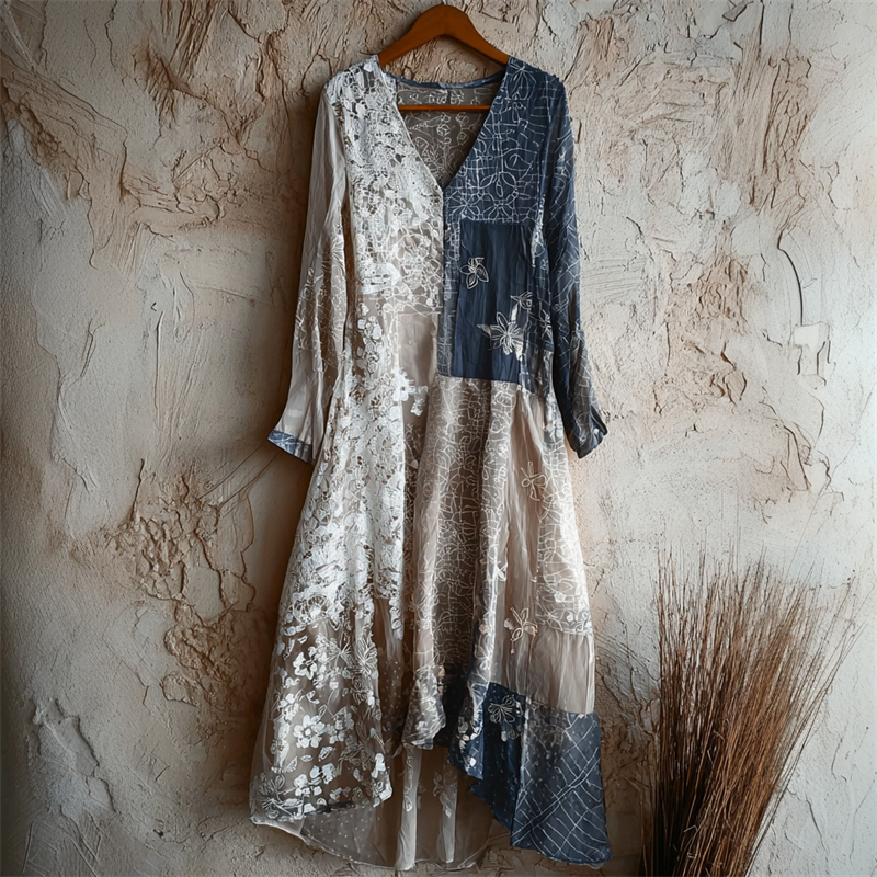 Japanese Floral Sashiko & Lace Flowy Maxi Dress