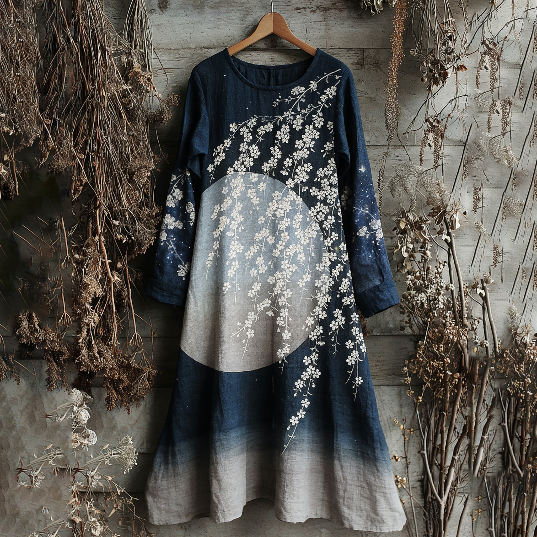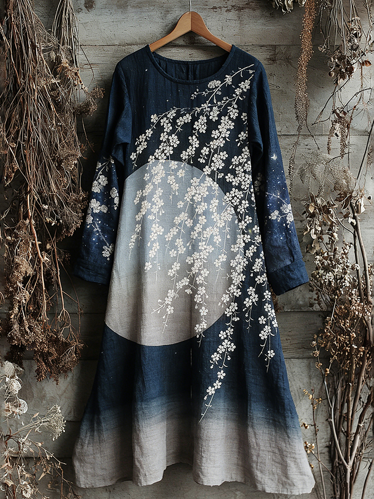 Vintage Japanese Floral Art Pattern Linen Blend Maxi Dress