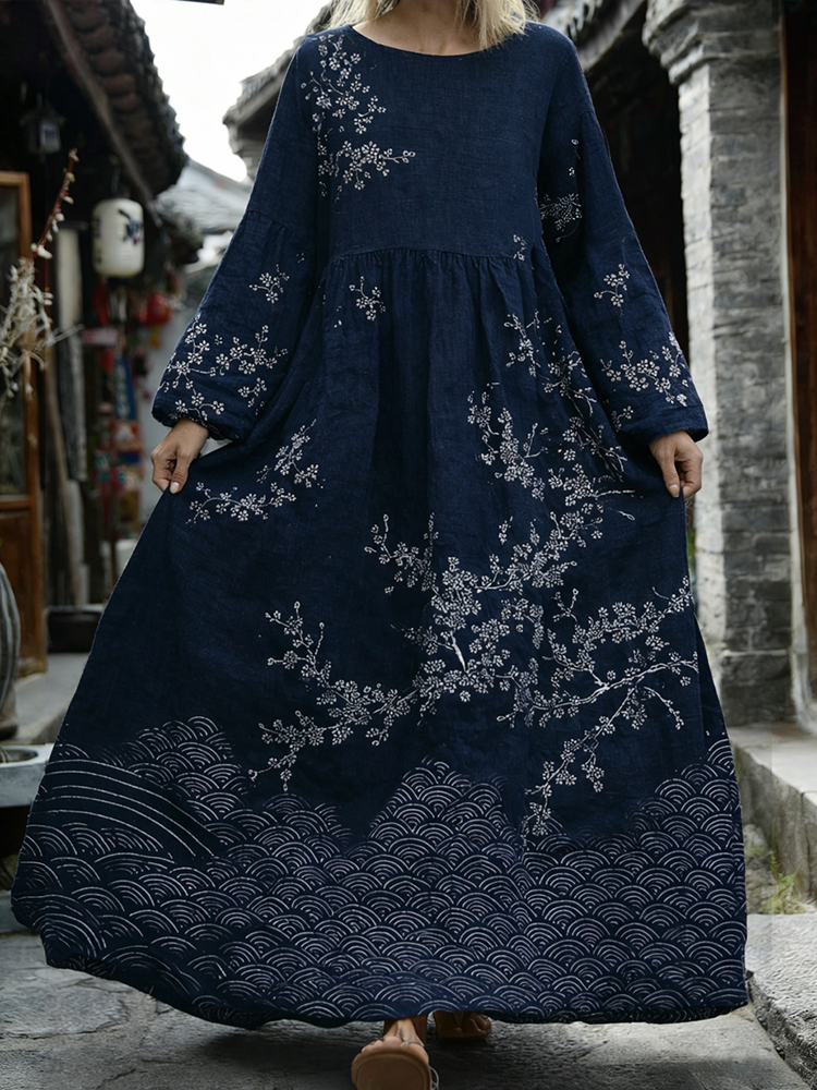 Women's Japanese Cherry Blossom Sea Waves Art Linen Flowy Maxi Dress