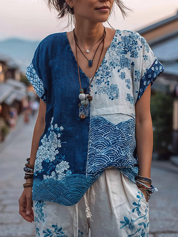 Women's Japanese Traditional Sashiko And Wave Patchwork Art V-neck Linen Blend T-shirt