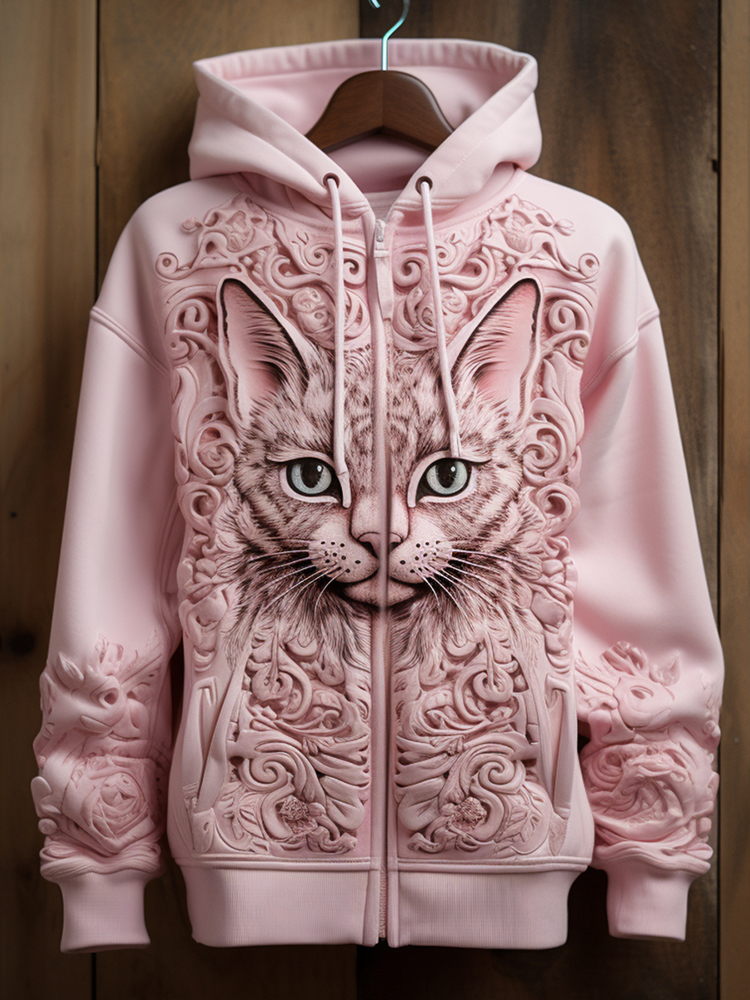 Women's Retro Cat Pattern Zippered Hooded Sweatshirt