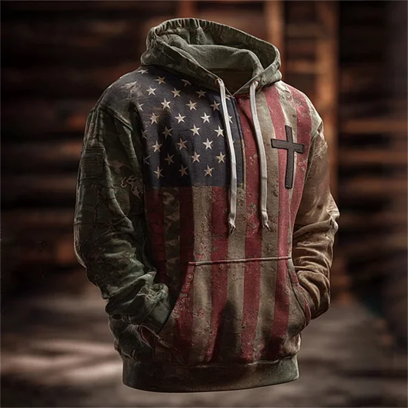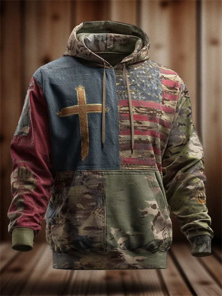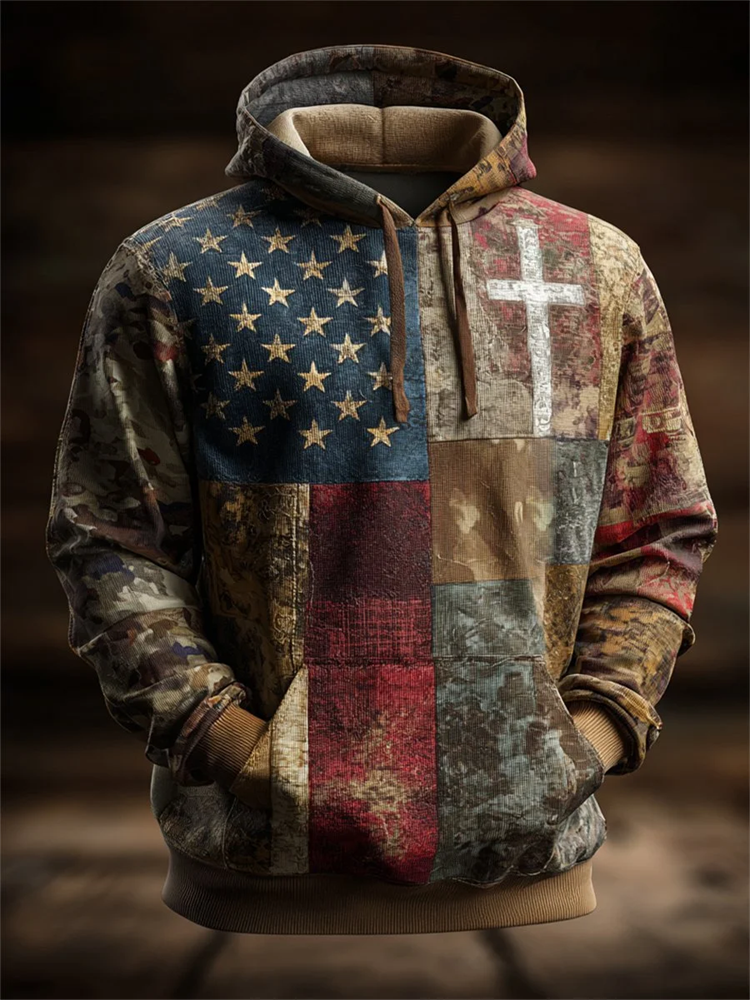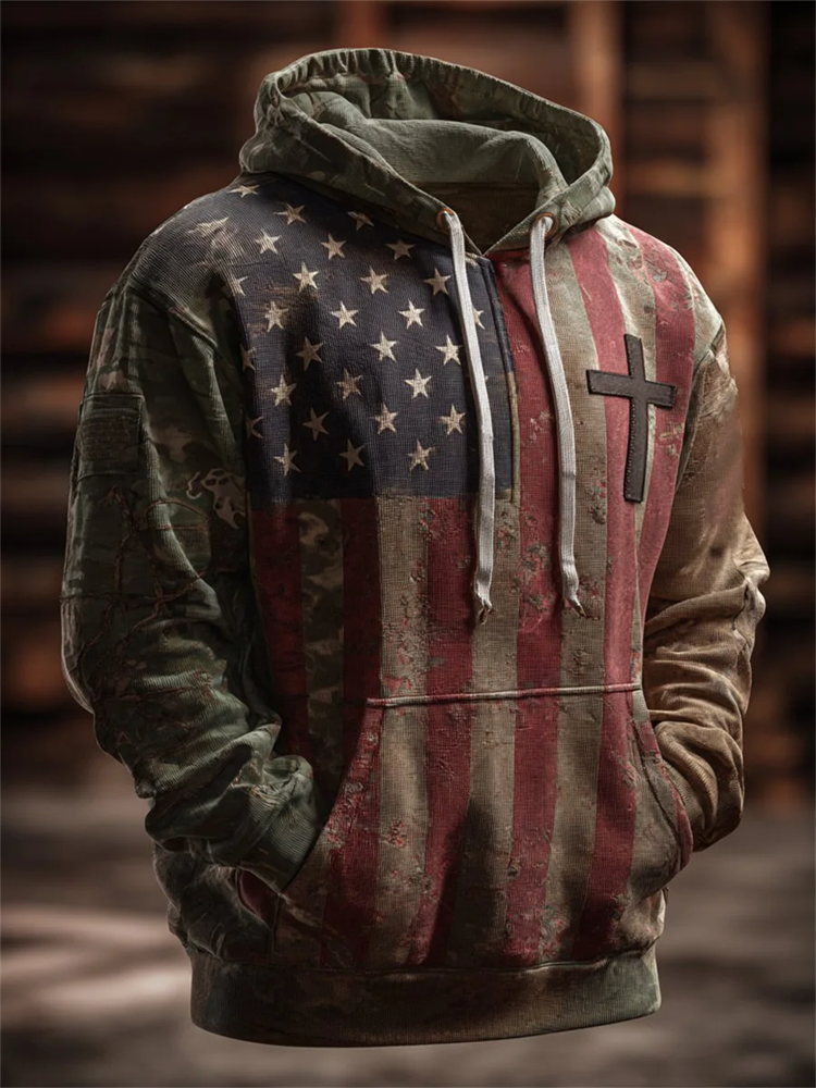 Men's Vintage Casual American Flag Cross Faith Hoodie