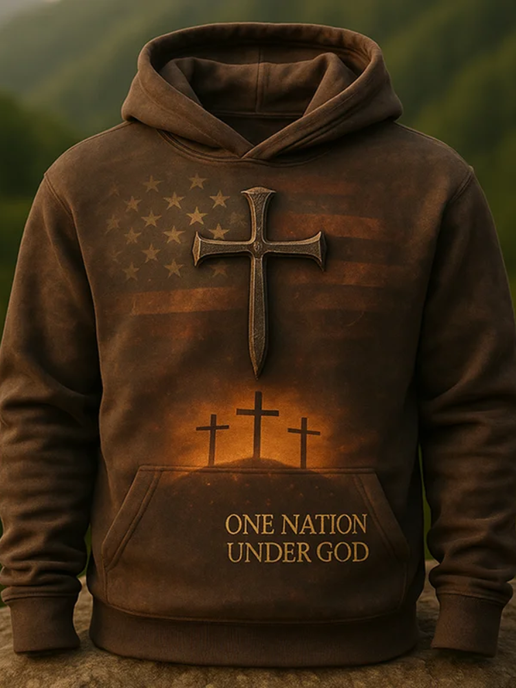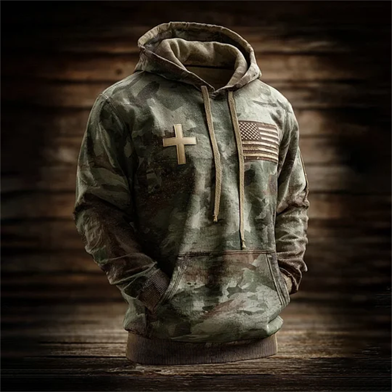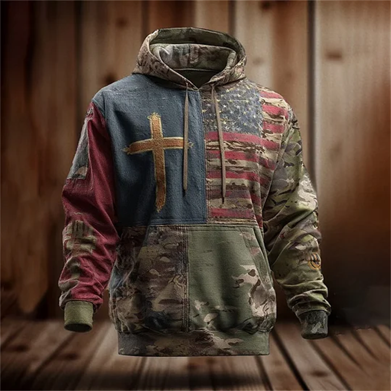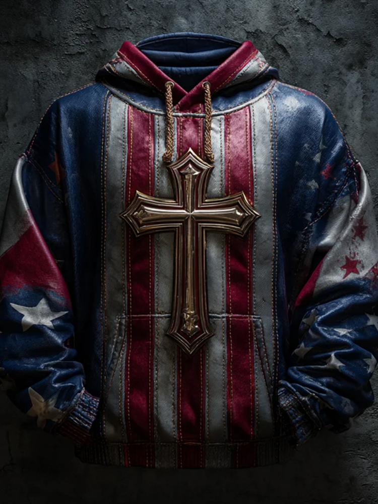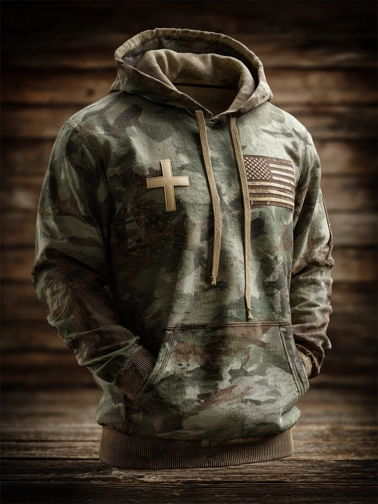 Men's Vintage Casual American Flag Cross Faith Hoodie