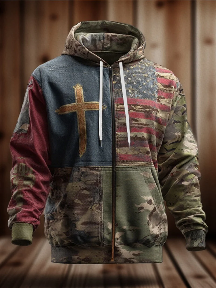 Men's Vintage Casual Faith American Flag Zip Hoodie