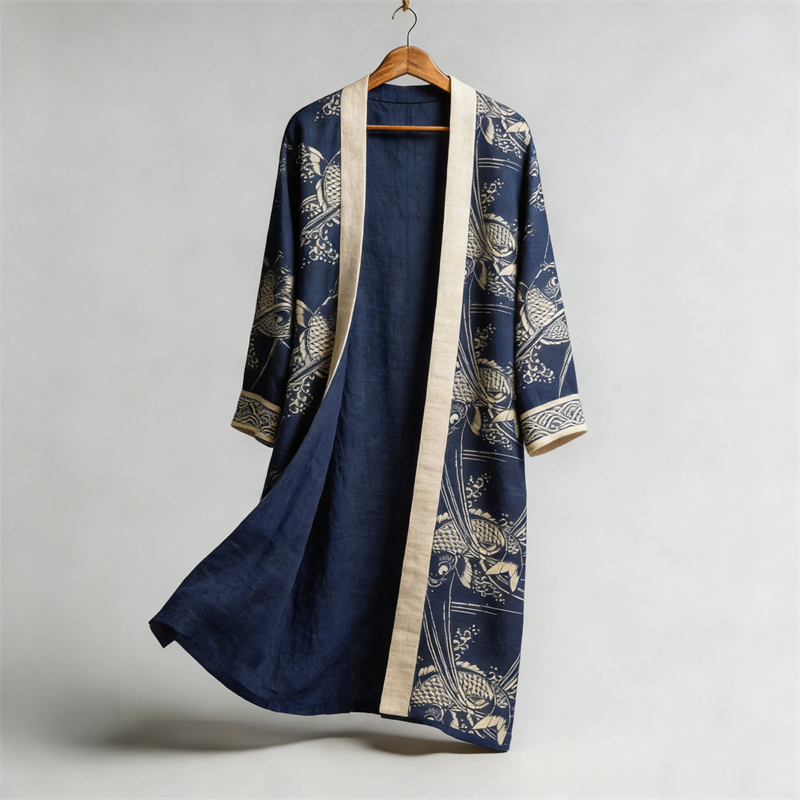 Japanese Koi Carp Fish Sea Waves Lino Art Flowy Linen Long Kimono