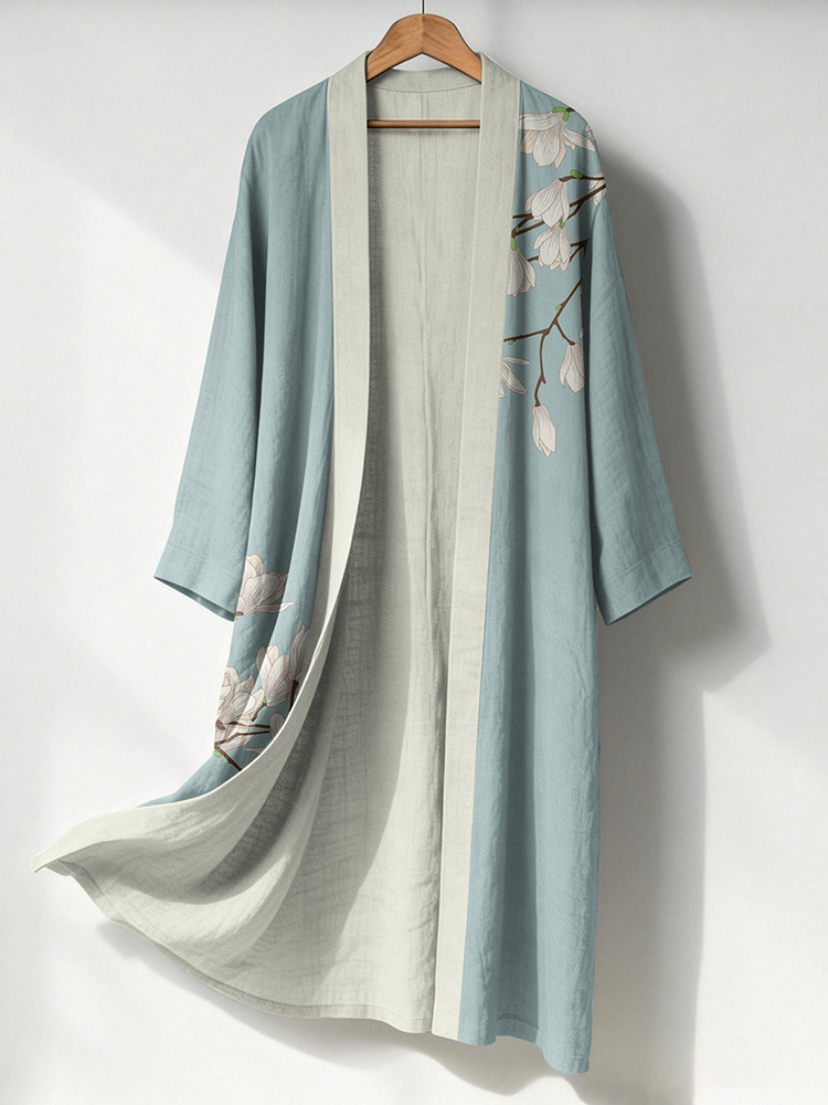 Japanese Magnolia Lino Art Flowy Long Linen Kimono