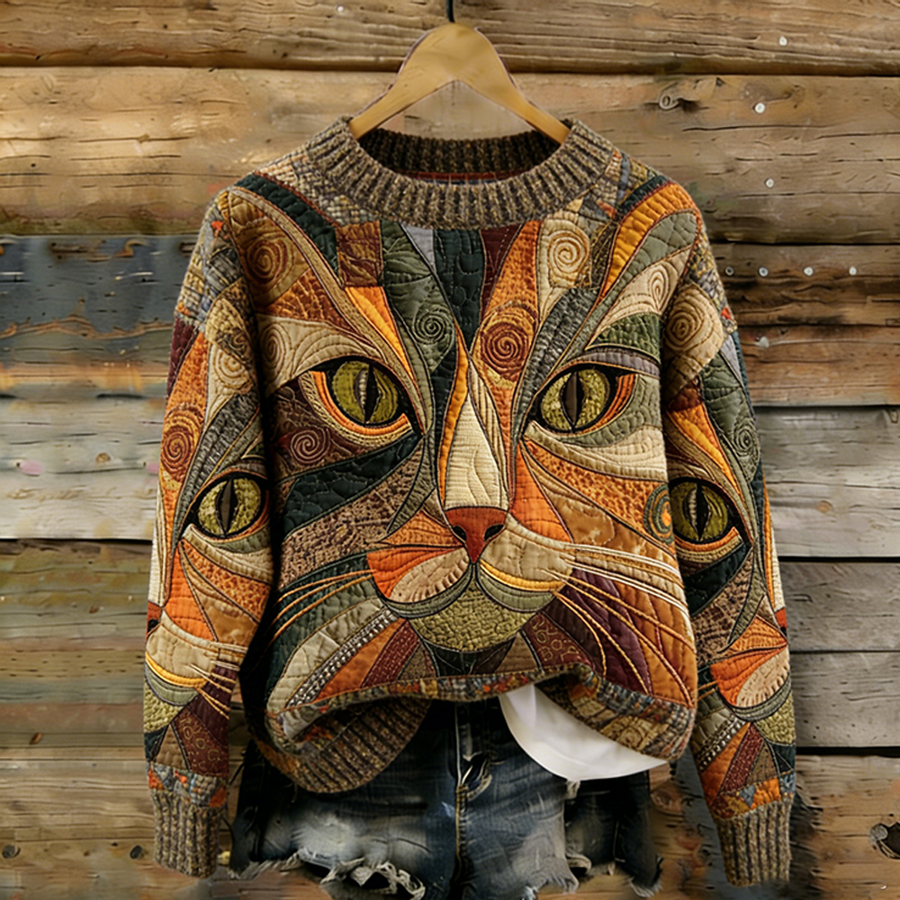 Artistic Patchwork Cat Head Round Neck Sweater