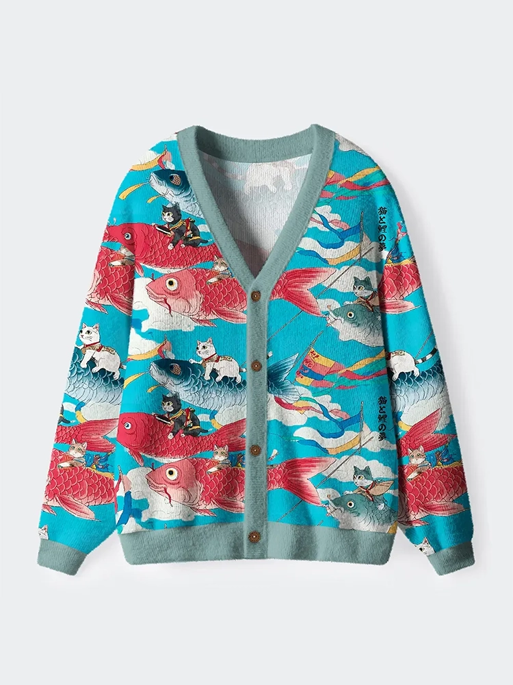 Cats And Japanese Carp Flags: A Dreamy Flight Ugly Cardigan Sweater