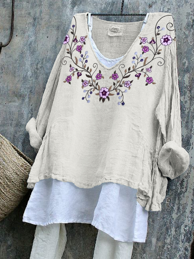 Floral Vines Embroidered V Neck Linen Blend Tunic