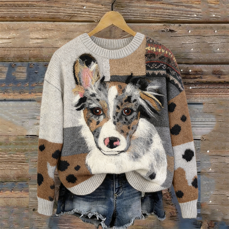 Fuzzy Dog Animal Pattern Colorblock Cozy Knit Sweater