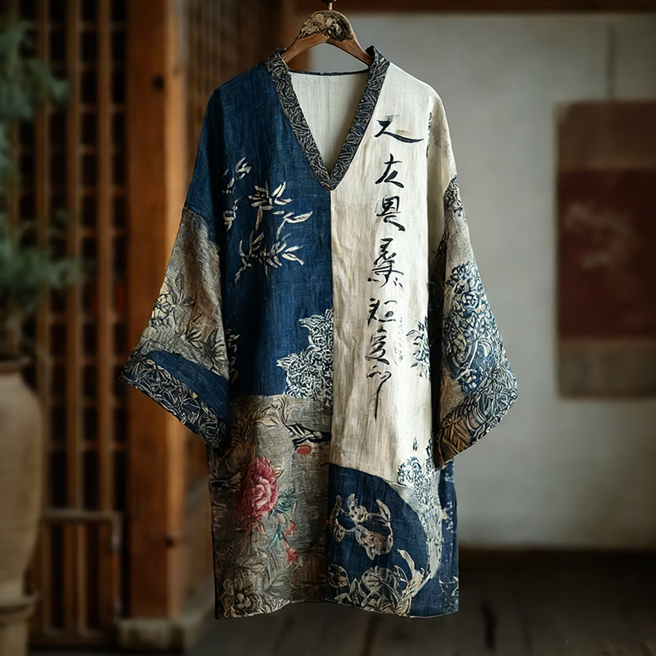 Japanese Art Retro Printed Patchwork Design V-neck Dress