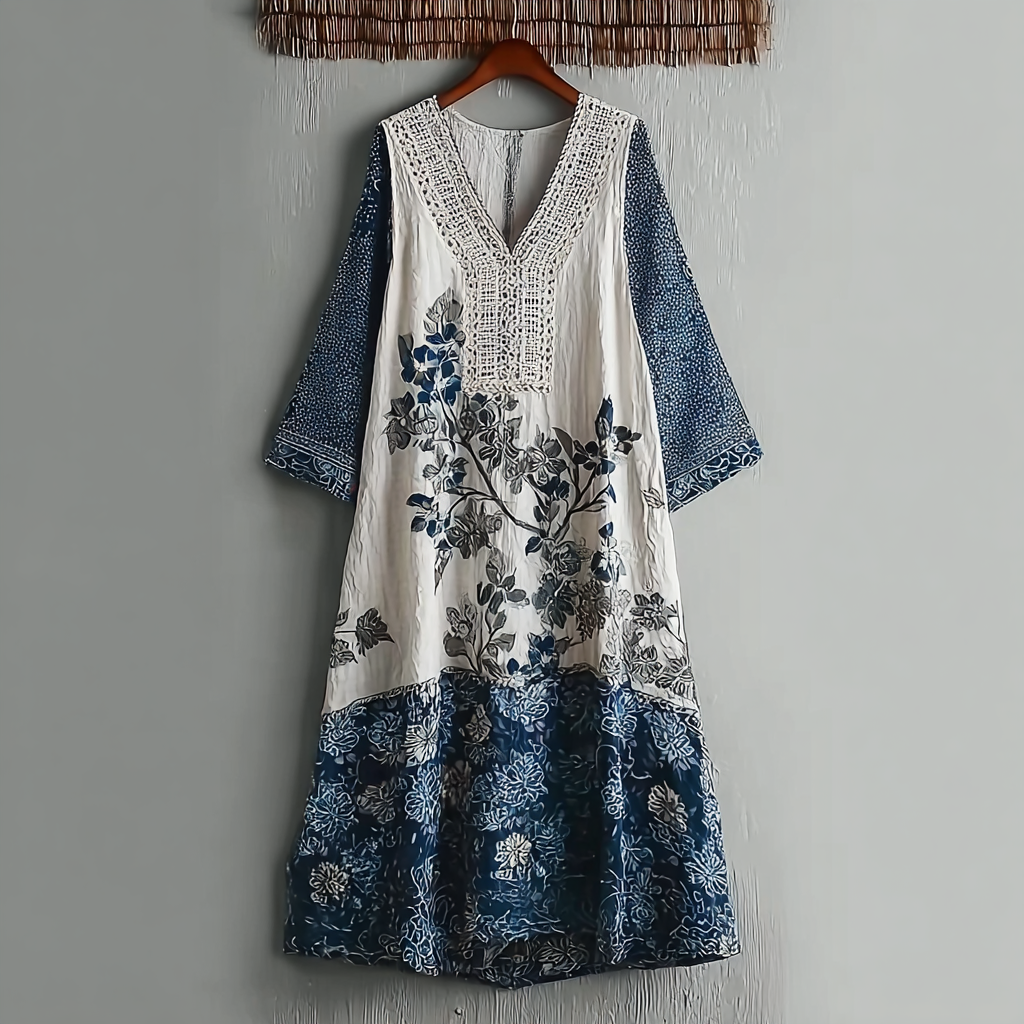 Japanese Art Retro Style Plant And Flower Pattern Patchwork Design V-neck Cotton And Linen Dress