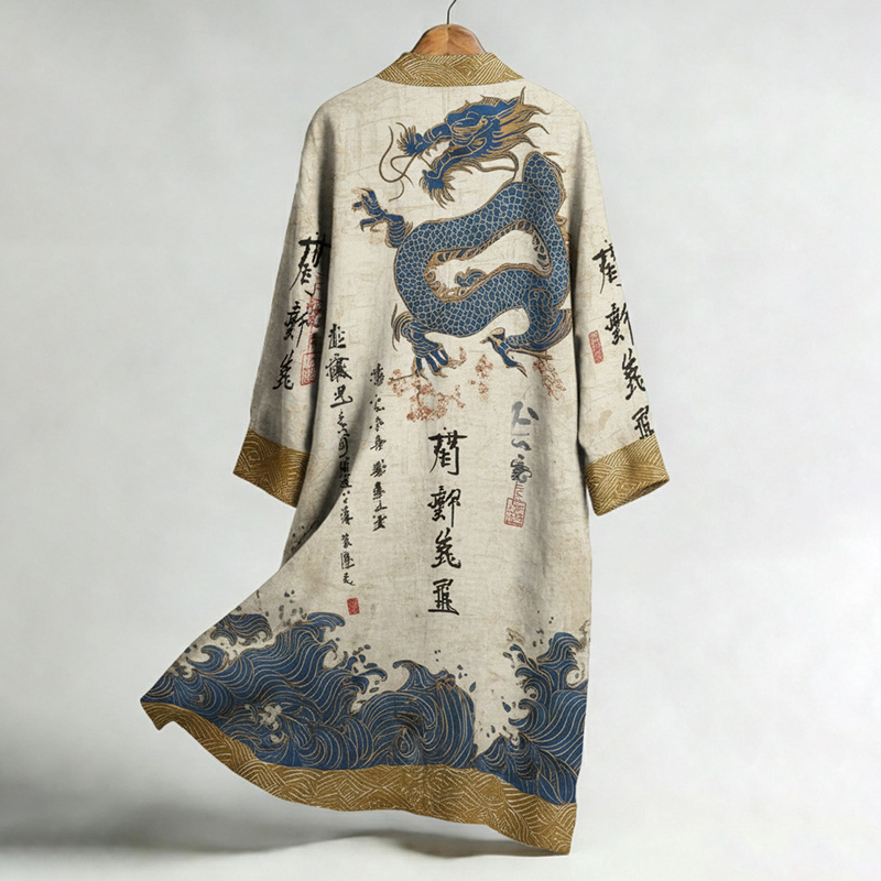 Japanese Calligraphy And Dragon Art Linen Blend Kimono Cardigan