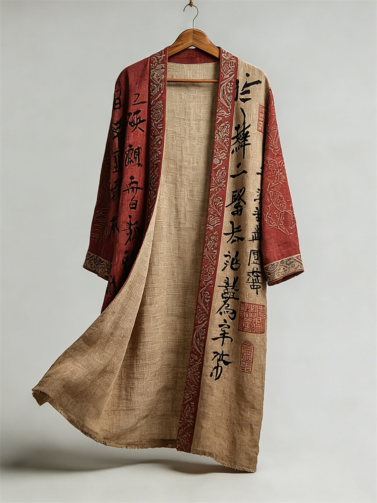 Japanese Calligraphy Art Contrast Linen Long Kimono