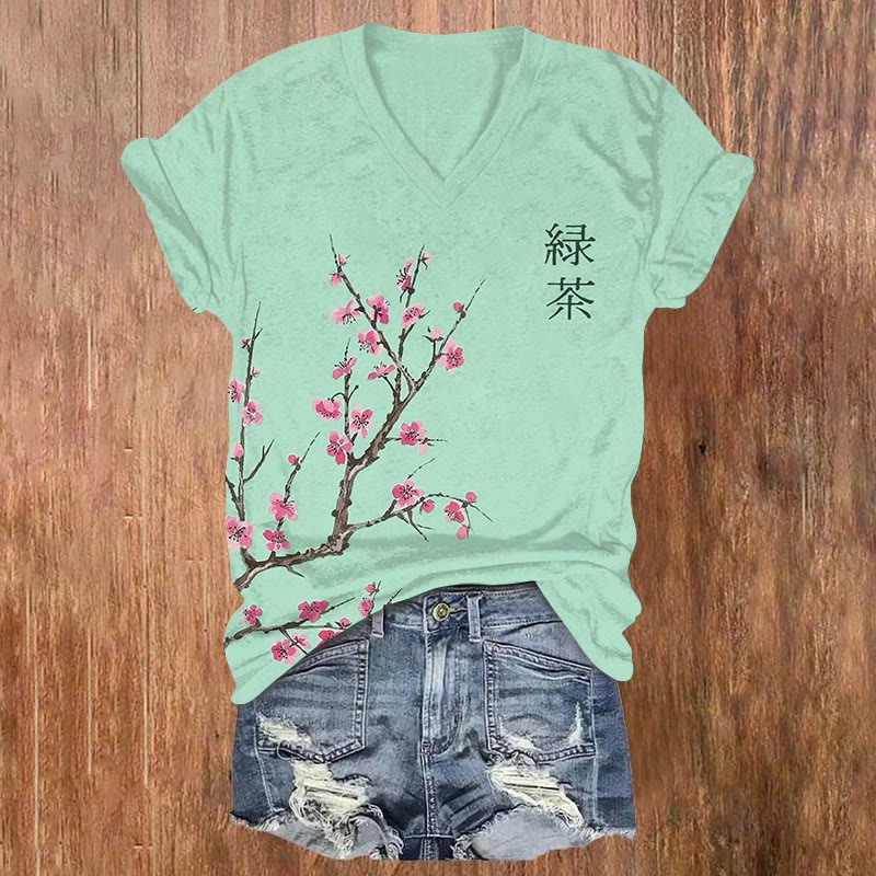 Japanese Cherry Blossom Print Short-sleeved V-neck T-shirt