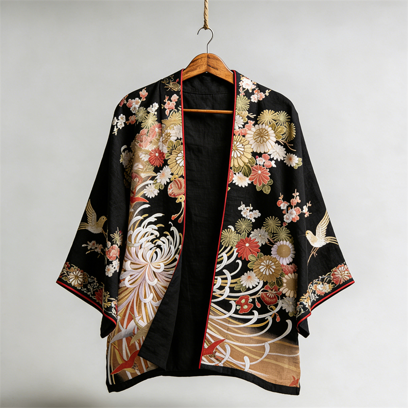 Japanese Chrysanthemum Floral Art Ethnic Linen Kimono