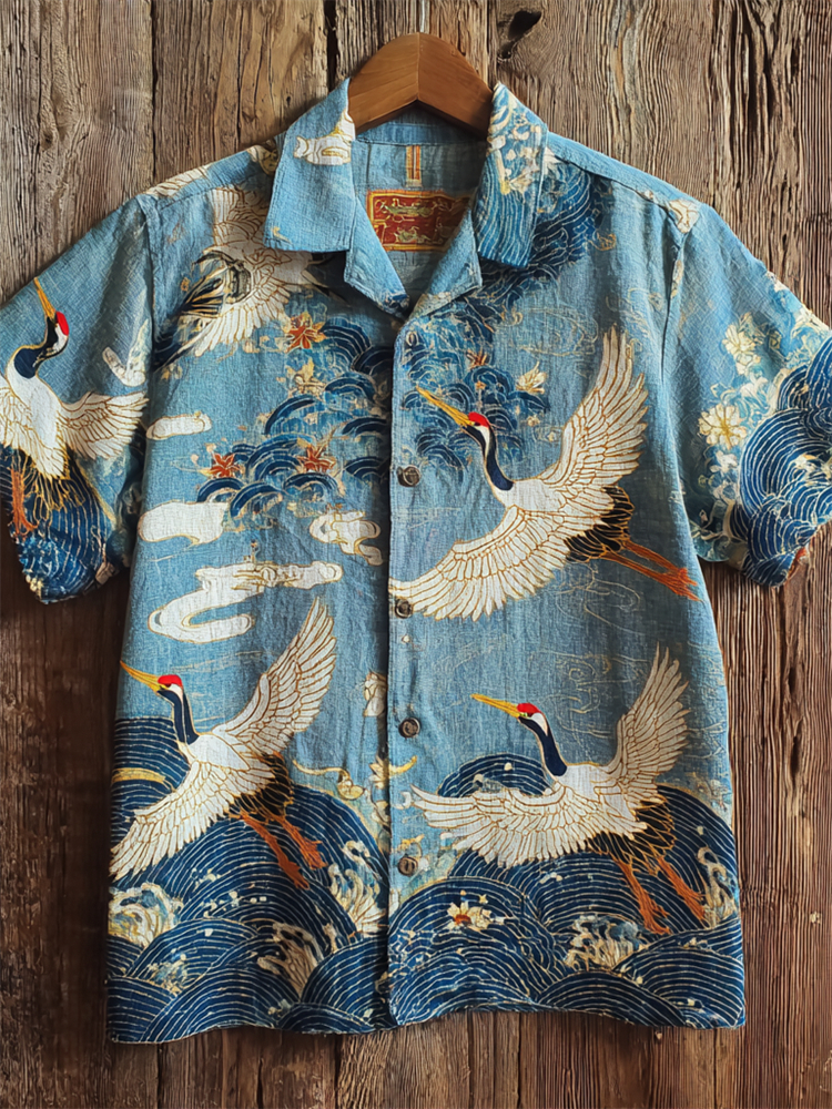 Japanese Cranes Floral Sea Waves Linen Shirt