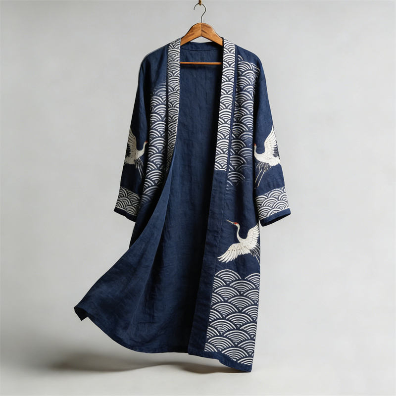 Japanese Cranes Sea Waves Flowy Long Linen Kimono