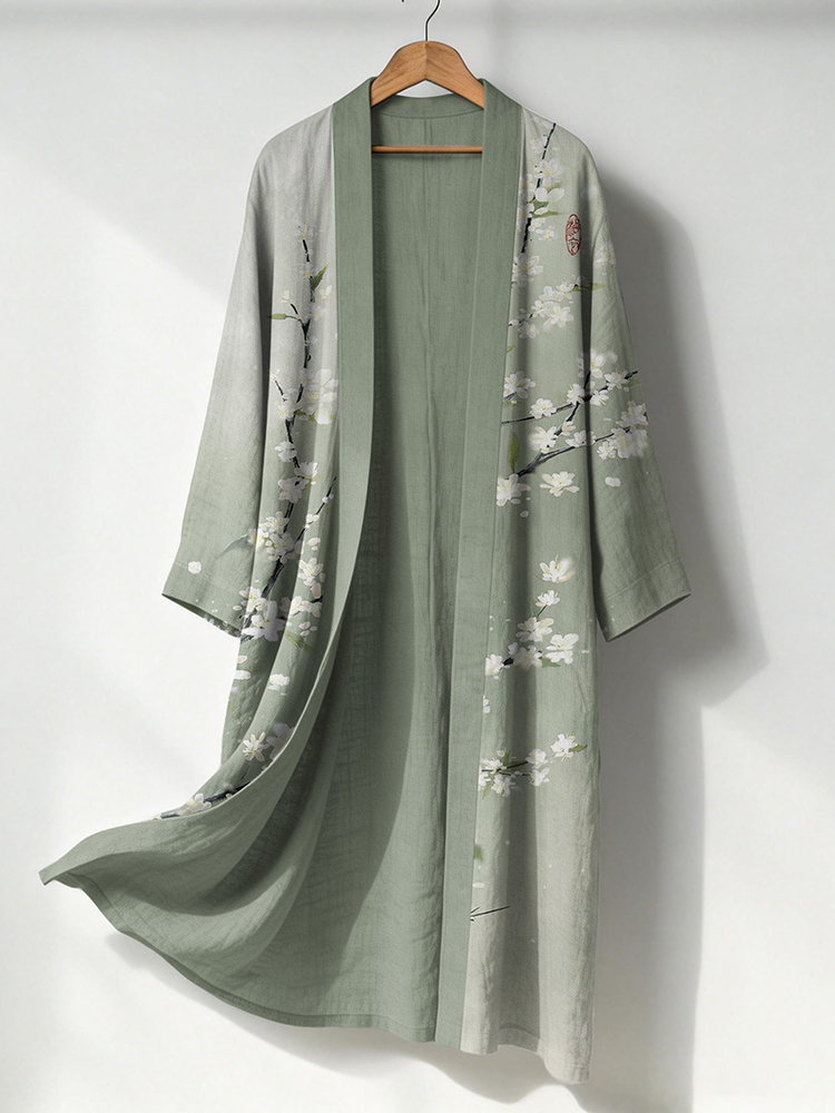 Japanese Floral Lino Art Flowy Long Linen Kimono