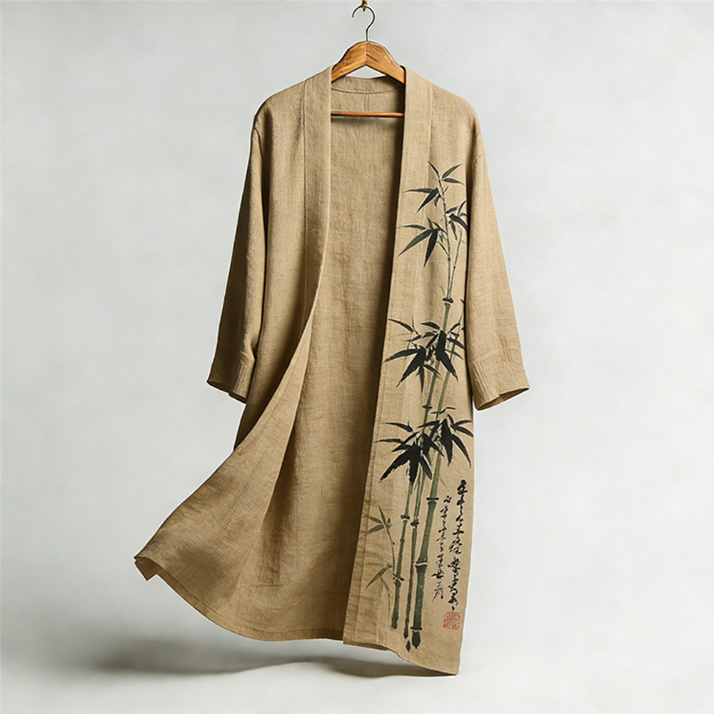 Japanese Ink Bamboo Painting Linen Flowing Linen Long Kimono