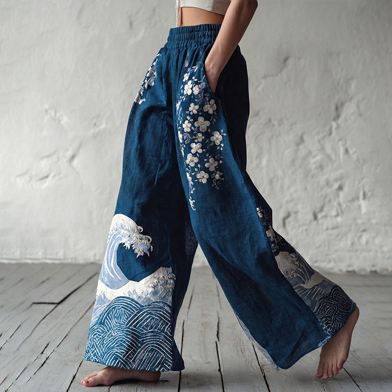Japanese-style Traditional Sashiko And Wave Art Pattern Casual Linen Pants