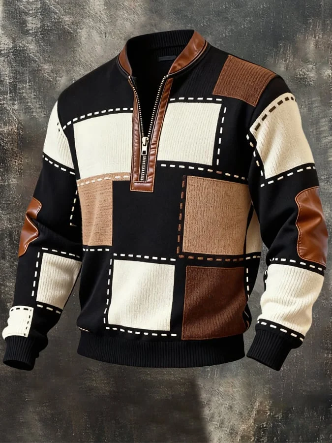 Men's Casual Retro Contrast Color Half Zip Stand Collar Long Sleeve Sweatshirt