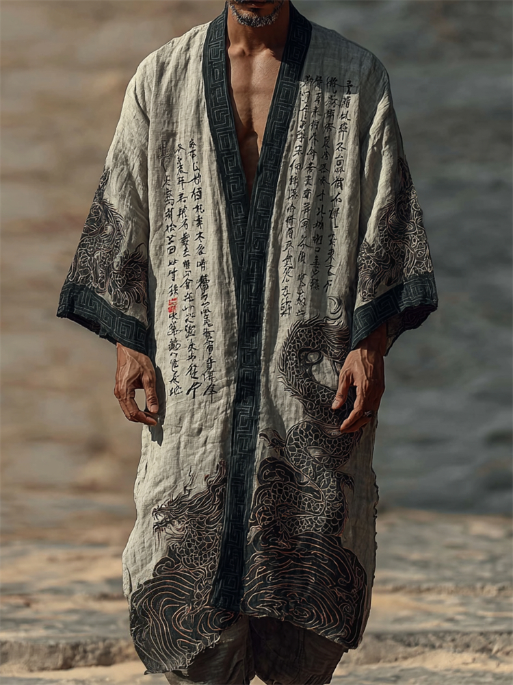 Men's Japanese Dragon Sea Waves Calligraphy Linen Long Kimono