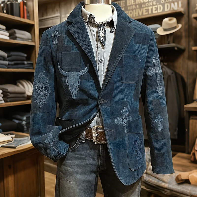 Men's Retro Bull Head And Cross Denim Graphic Corduroy Blazer