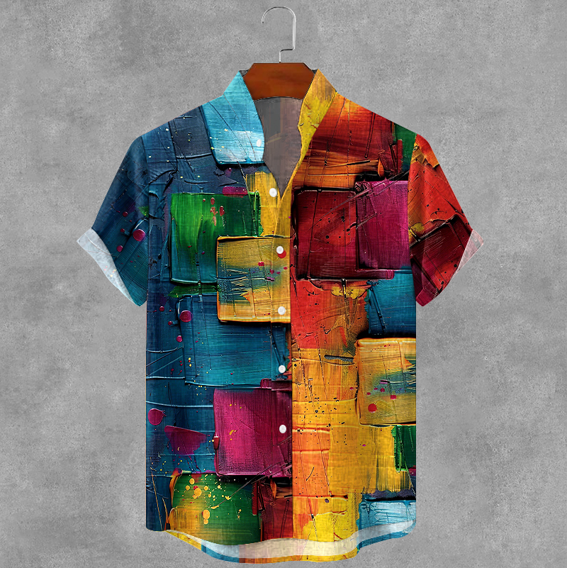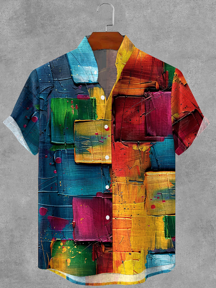Men's Retro Colored Oil Painting Plaid Art Print Cotton And Linen Shirt