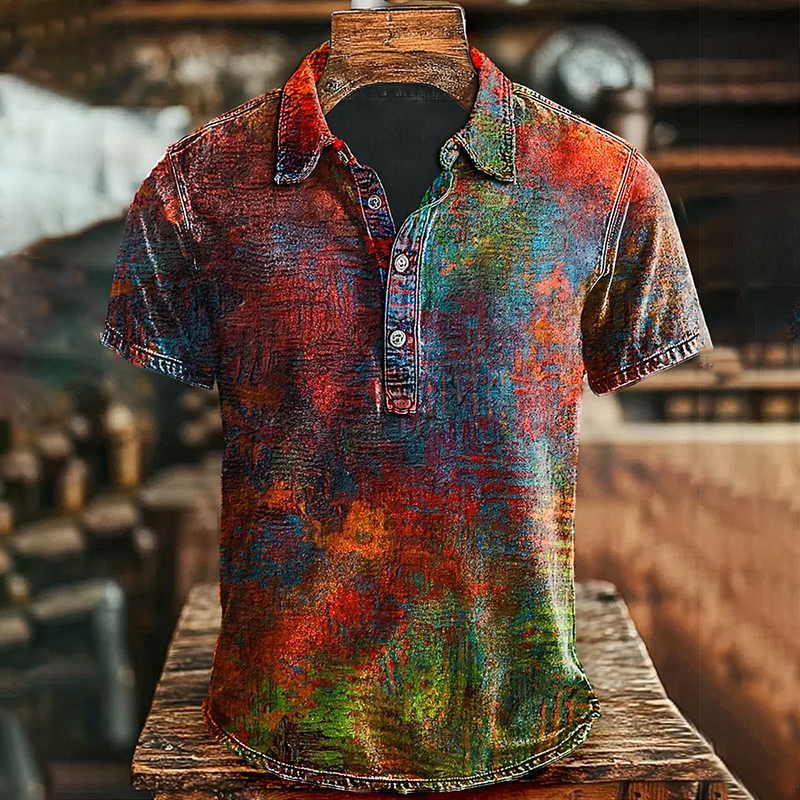 Men's Retro Colorful Old Printed Casual Short Sleeve Polo Shirt