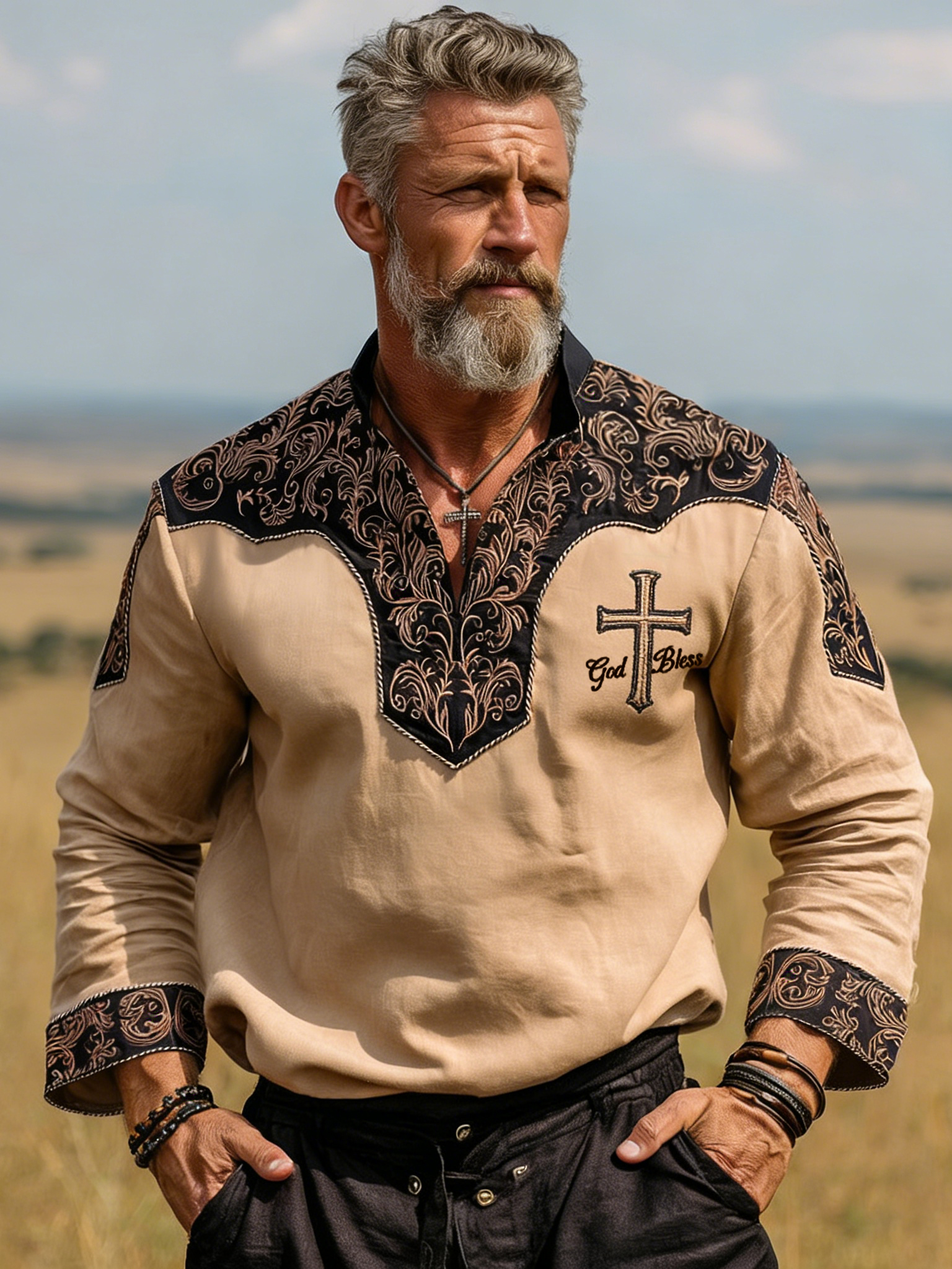Men's Vintage Faith Cross Western Cowboy Style Cozy Cotton And Linen Henley Collar Shirt