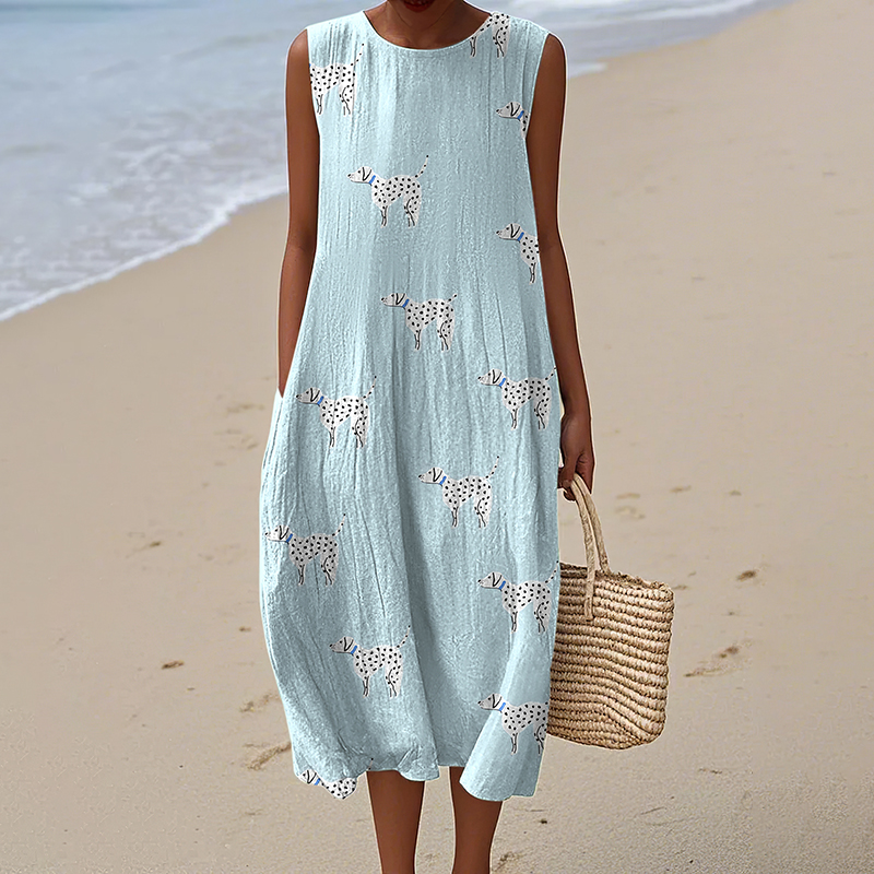 Retro Cute Dalmatian Dog Art Linen Tank Midi Dress