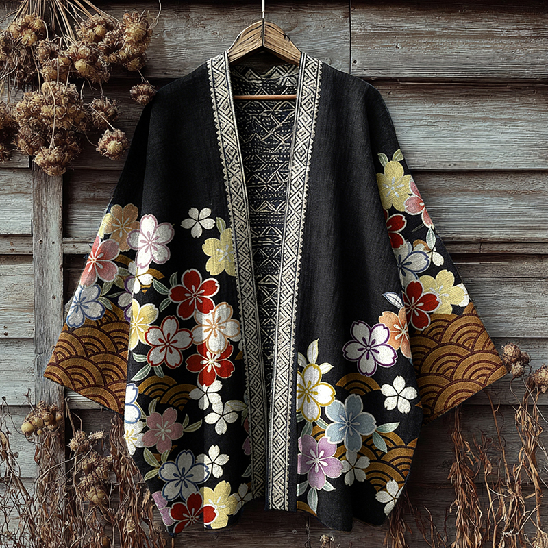 Retro Japanese Floral Art Print Cotton And Linen Blend Kimono Cardigan