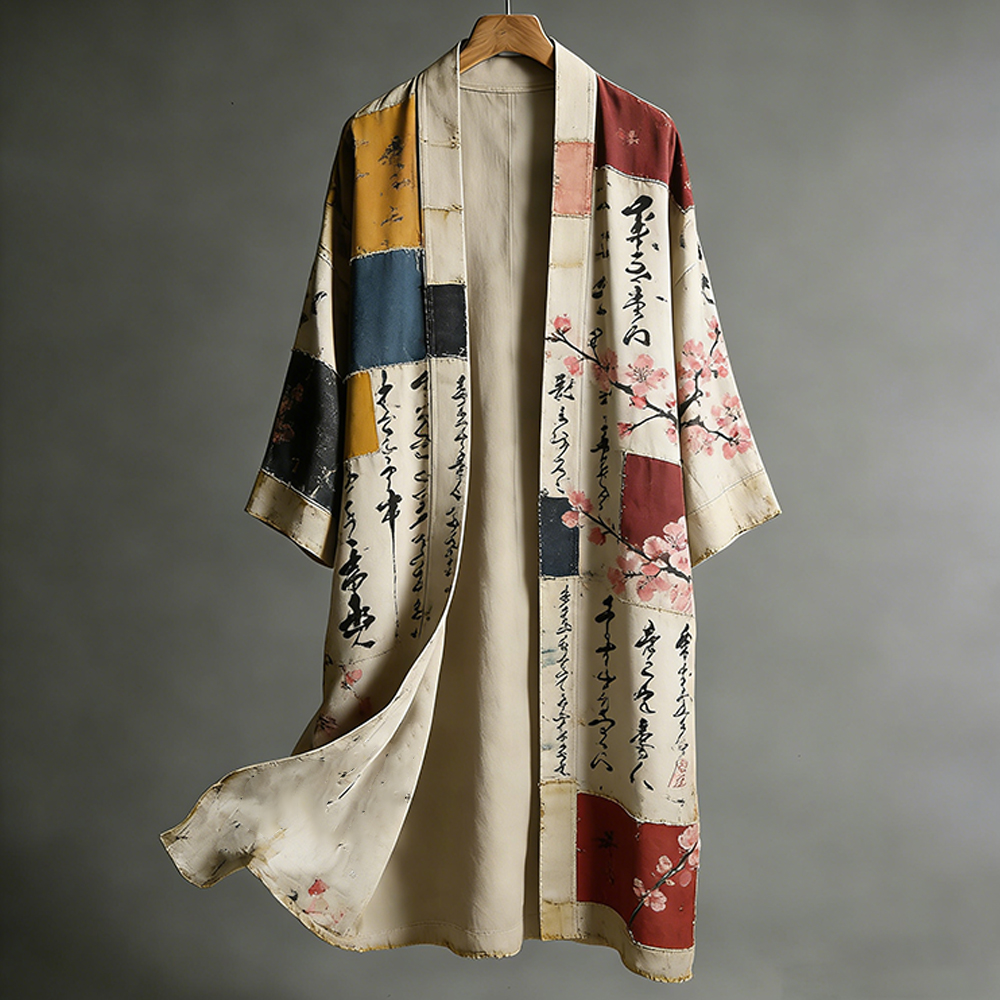Retro Japanese Patchwork Art Cherry Blossom Linen Long Kimono