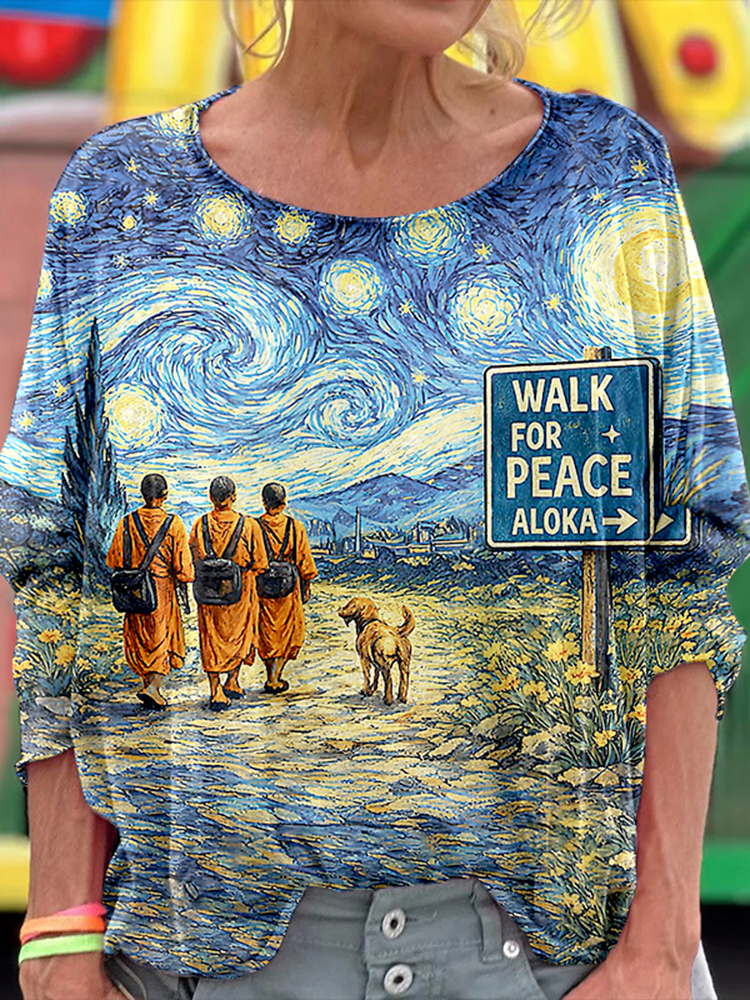 Retro Starry Night Monk And Aloka Dog Print T Shirt