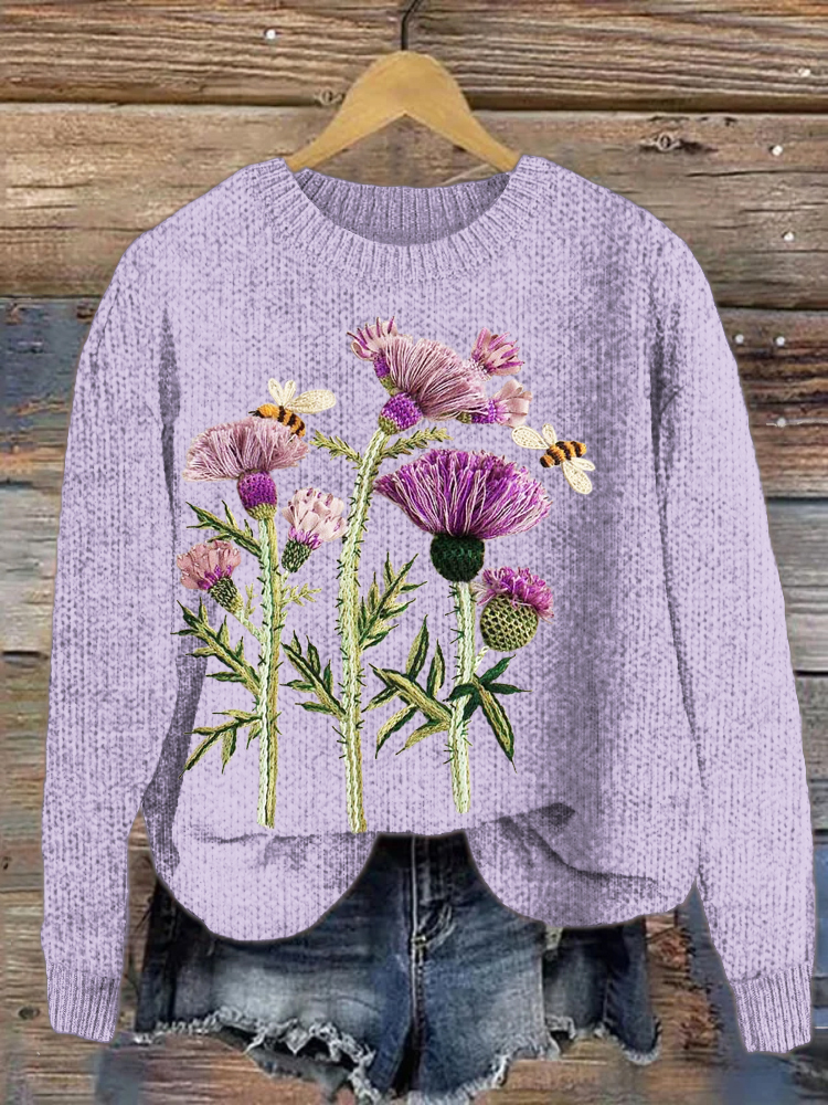Scottish Thistle Flower Embroidery Women's Knit Sweater
