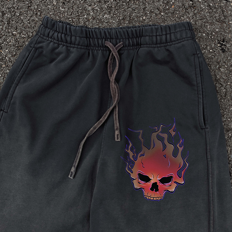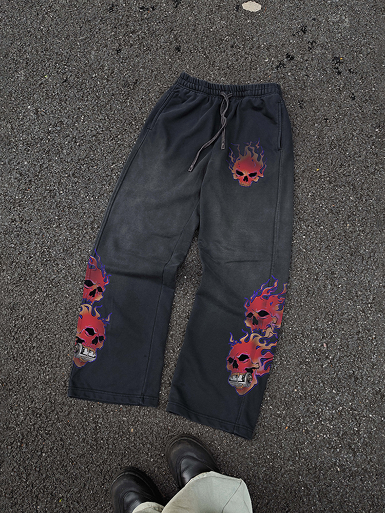 Vintage Washed And Distressed Loose-fitting Sweatpants With Flame And Skull Graphic