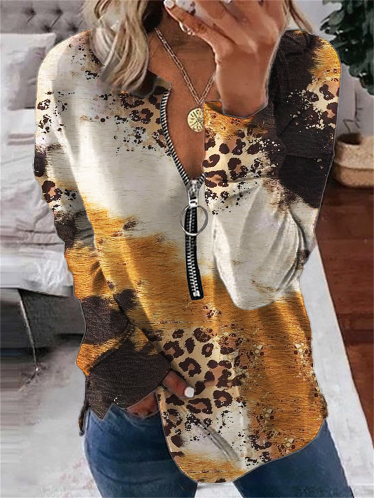 Western Leopard Tie Dye Zip Long Sleeve Sweatshirt