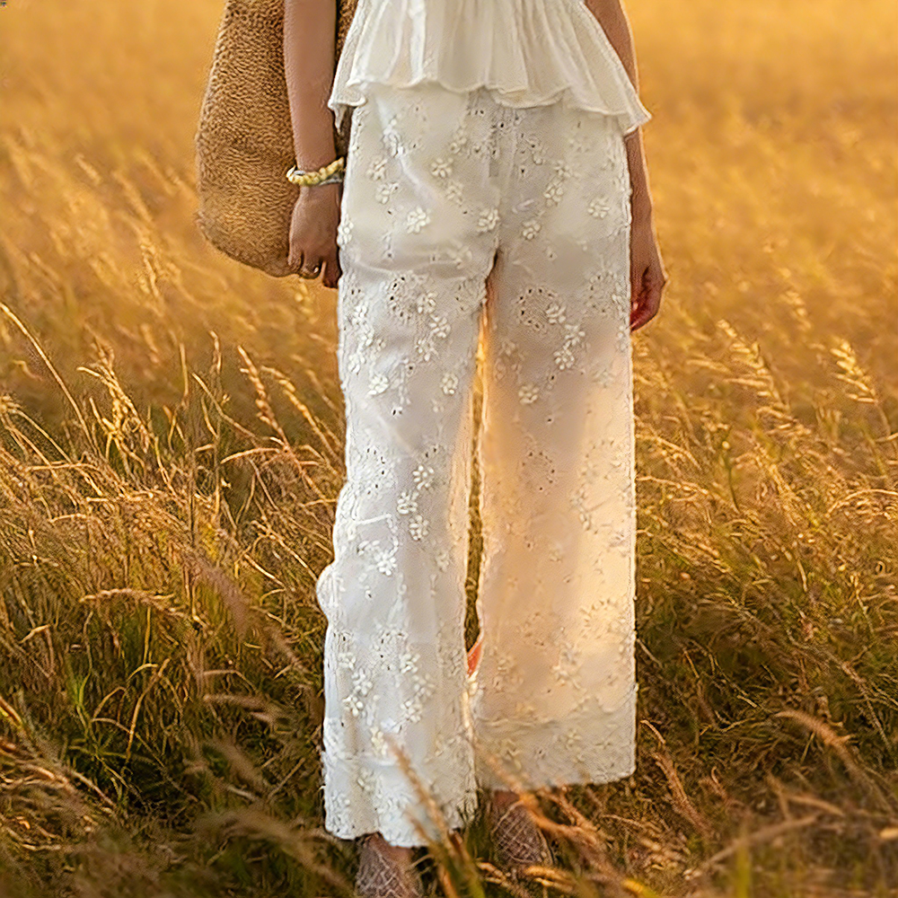 White Openwork Lace Embroidered Wide Leg Casual Pants