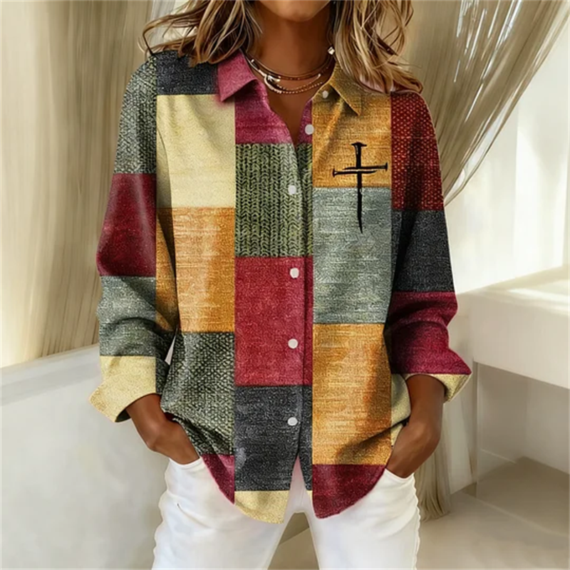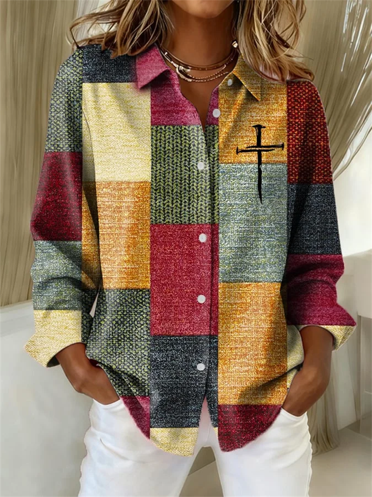 Women's Casual Autumn And Winter Retro Color Block Contrast Faith Shirt