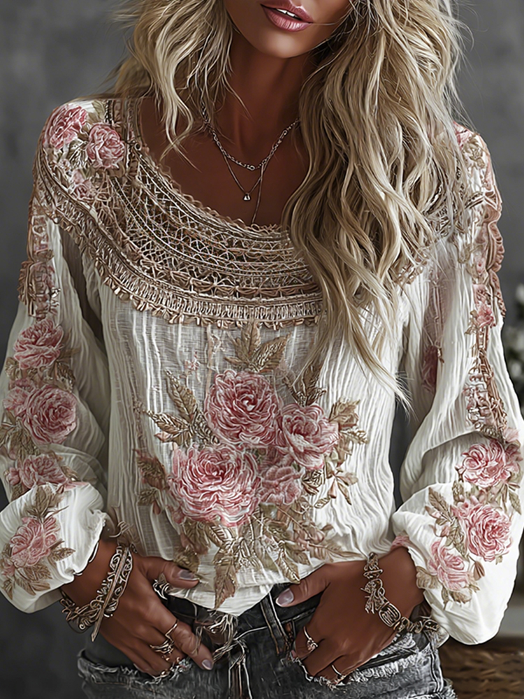 Women's Floral Embroidered Art Print Flowy Linen Blend Casual Tops