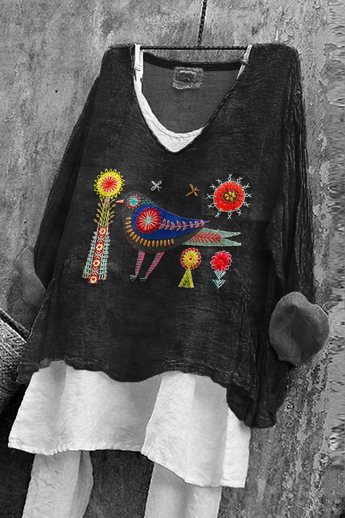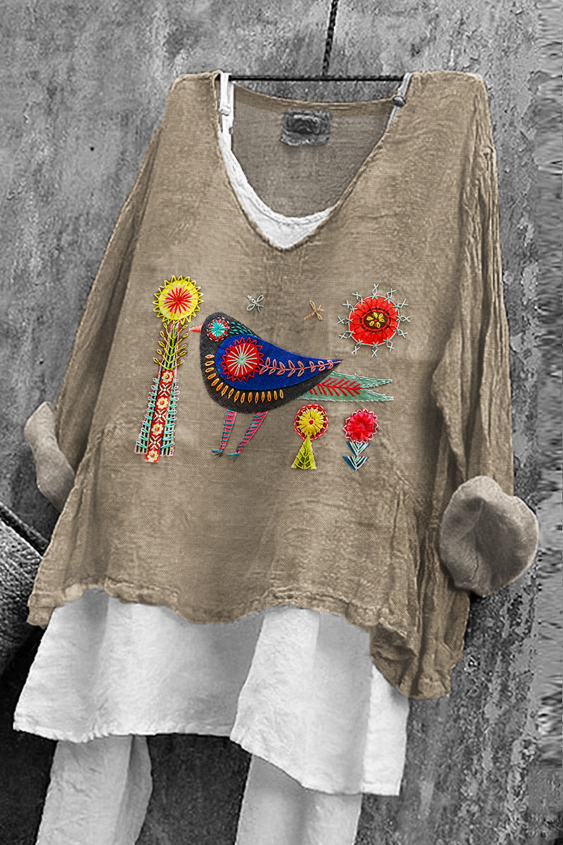 Women's Flower And Bird Embroidery Art Linen V-neck Shirt