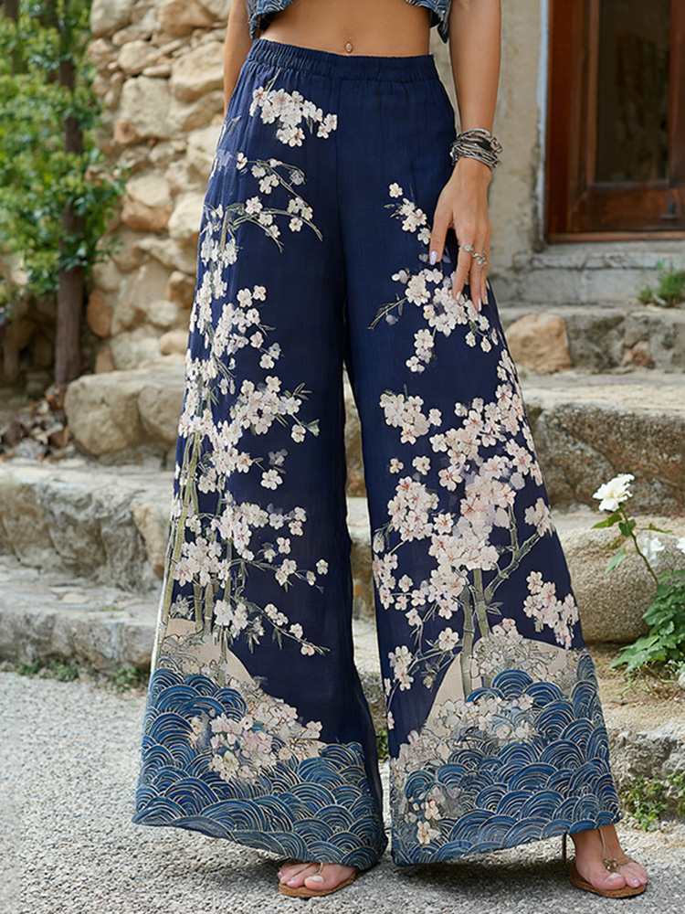 Women's Japanese Cherry Blossom And Wave Art Print Pants