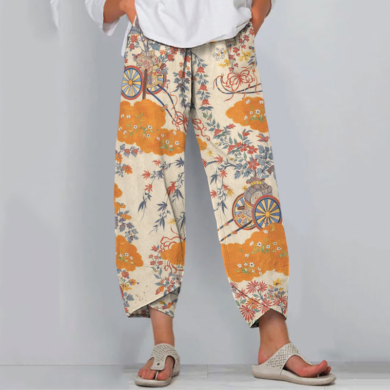 Women's Japanese Floral Art Print Linen Blend Casual Pants