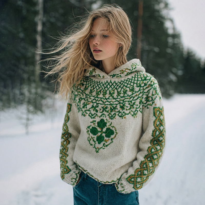 Women's Retro St. Patrick's Day Four-leaf Clover Pattern Knit Hoodie